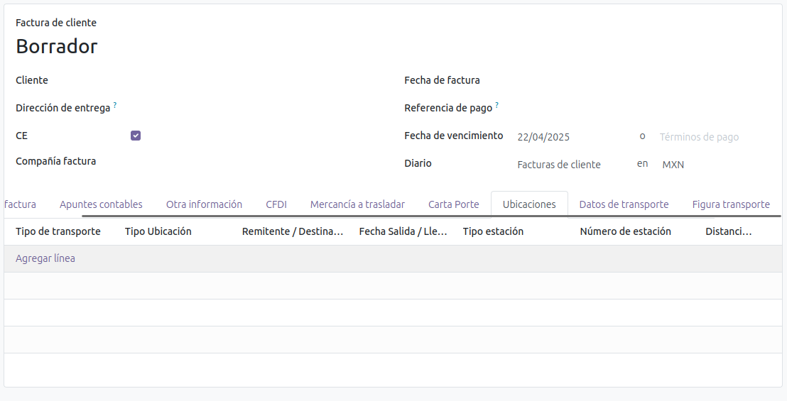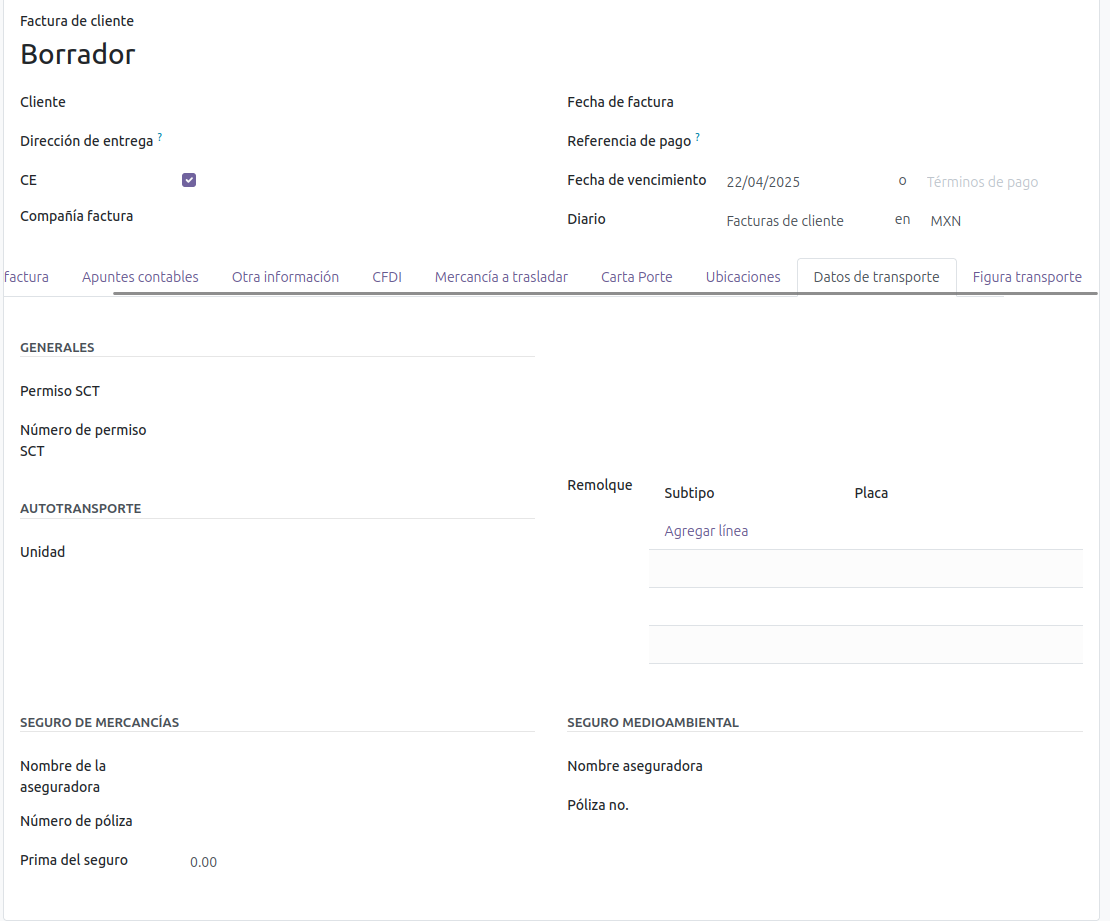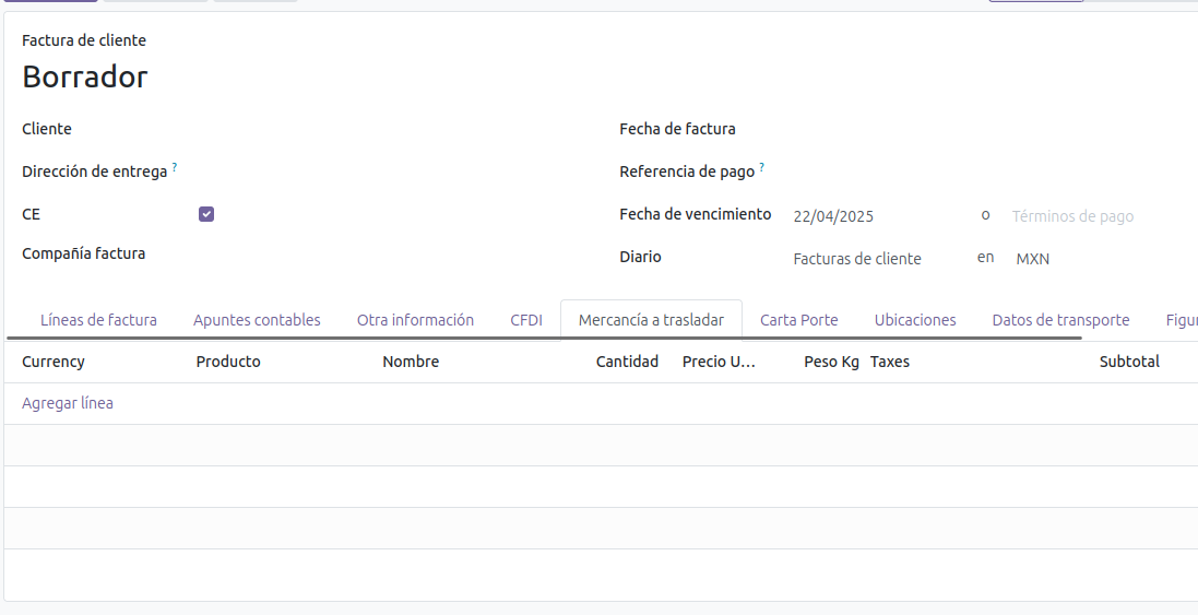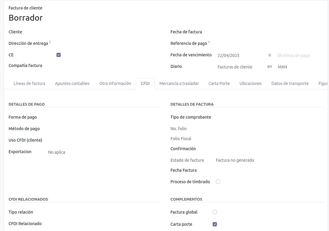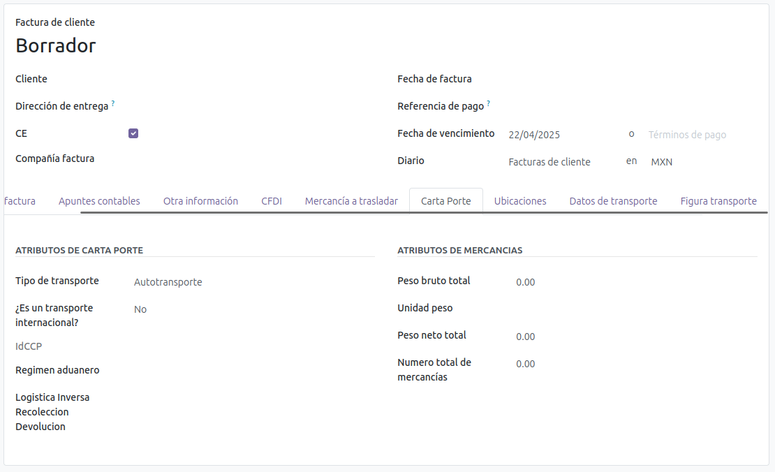 - En los documentos de factura se debe habilitar la opción de "Carta porte" para ver la información adicional a llenar.