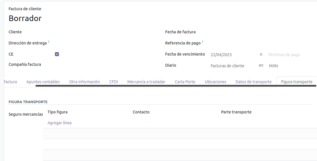 - En la pestaña "Figura de transporte" se agregan los tipos de figura requeridos para el traslado.