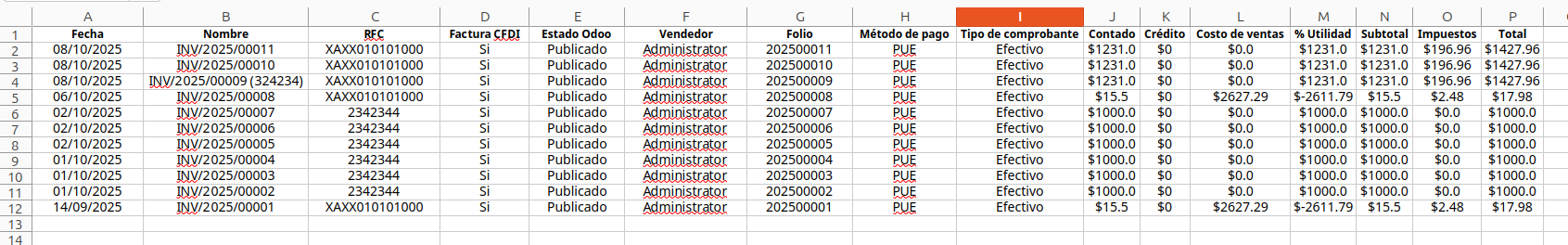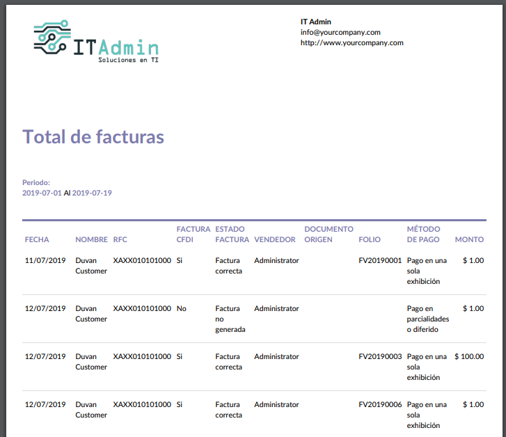 El módulo permite generar un reporte de facturas en XLS o PDF.