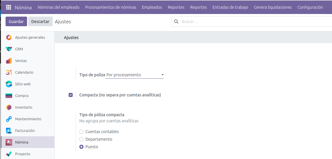 - Se puede configurar como se generan las pólizas: por procesamiento o por nómina. También se pueden compactar las pólizas agrupando la información.