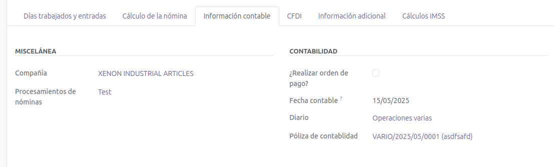 - En la sección de contabilidad de la nómina aparece la póliza creada.