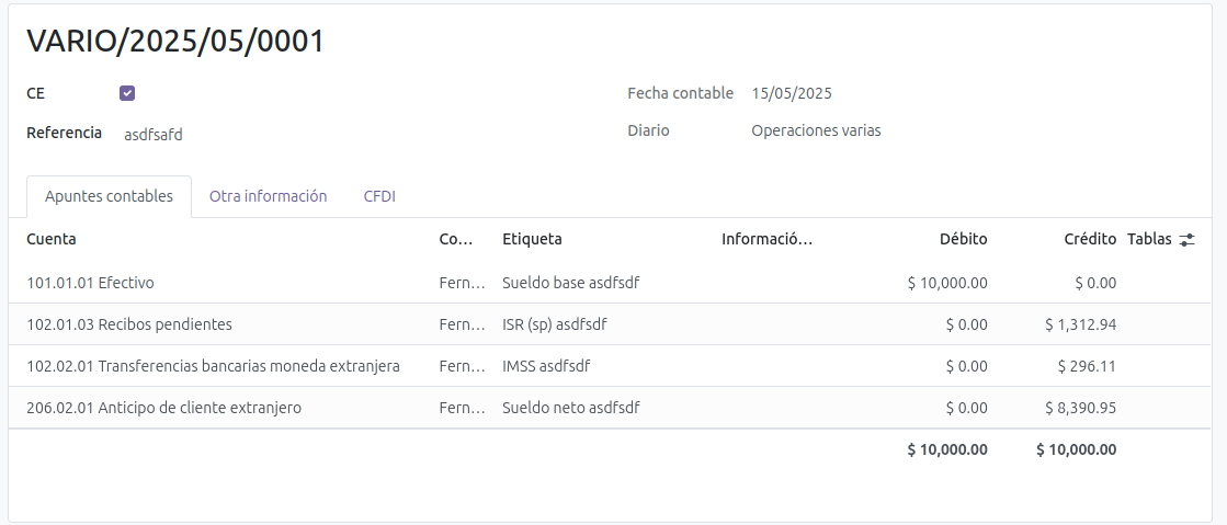 - La póliza contiene los conceptos de nómina y las cuentas contables configuradas